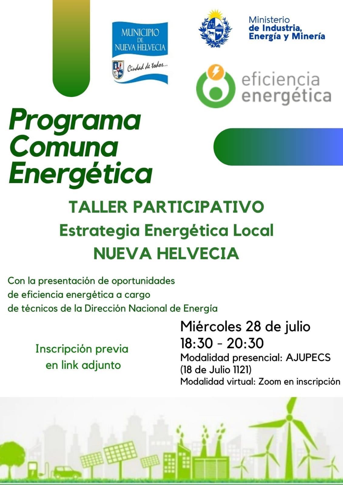 El Municipio de Nueva Helvecia y la Dirección Nacional de Energía invita a la población a participar en el taller del Programa Comunas Energéticaa desarrollarse en AJUPECS el miércoles 28 desde 18:30hs