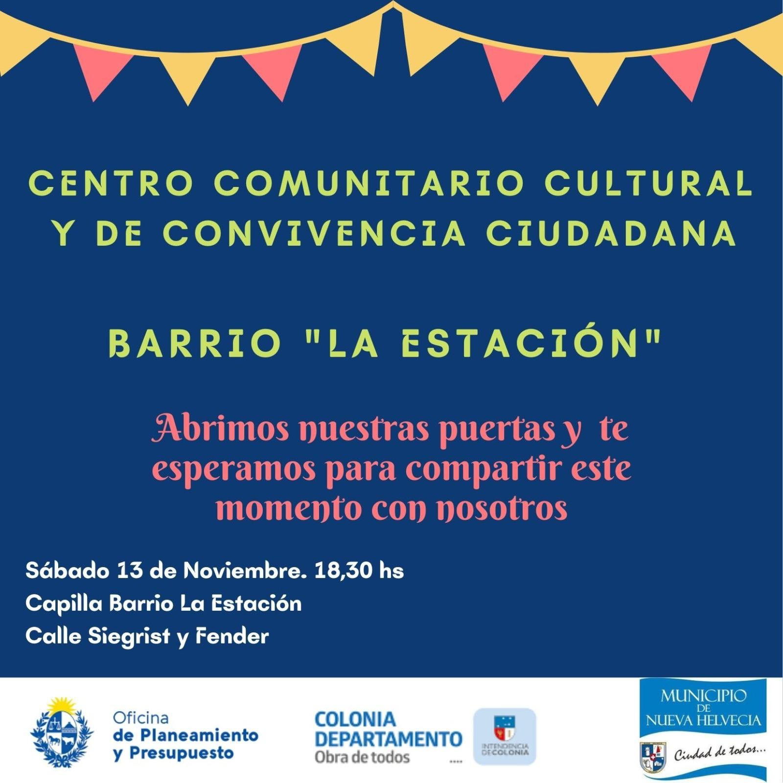 El sábado 13 de noviembre a las 18:30 horas, estaremos abriendo nuestras puertas del Centro Comunitario Cultura y de Convivencia Ciudadana en Barrio Estación.