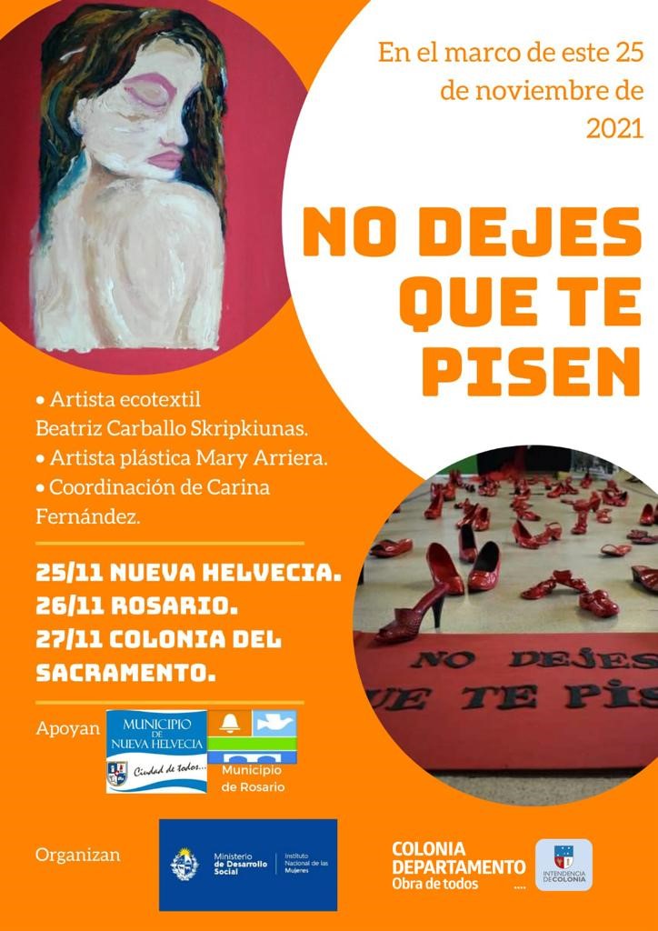 “No dejes que te pisen” es una intervención artística urbana, a cargo de Beatriz Carballo Skripkiunas, artista eco-textil (de origen libanés y oriunda de Montevideo); Mary Arriera, artista plástica (Coloniense) y Carina Fernández, coordinadora del proyecto (integrante y referente del equipo de género del Municipio CH, de Montevideo) ”.