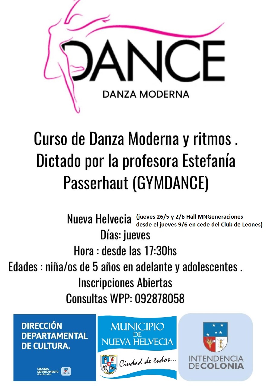 La Dirección de Cultura de la Intendencia de Colonia invita para inscribirse a la actividad de Danzas Modernas dictado por Estefanía Passerhaut Información e inscripción por Whats App 092878058 Navegación de entradas Fin del Programa Oportunidad Laboral Avanza la poda, obras en la ciudad y planificación de la 8va Fiesta Nacional del Chocolate