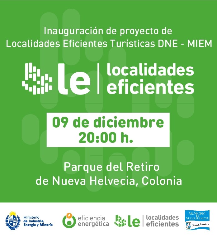 El Municipio de Nueva Helvecia, conjuntamente con la Dirección Nacional de Energía, tienen el agrado de invitar a la población a la inauguración de la iluminación del sendero Parque El Retiro de Nueva Helvecia. Esta obra, surge como resultado de la postulación del Municipio de Nueva Helvecia al Fondo Localidades Eficientes Turísticas otorgado por la Dirección Nacional de Energía del Ministerio de Industria, Energía y Minería donde es seleccionado ganador.El proyecto es postulado por el gobierno local con la intención de continuar con los esfuerzos de hacer de los espacios públicos lugares disfrutables, seguros y energéticamente eficientes para todos los neo helvéticos. El costo total de los fondos extra presupuestales adquiridos para esta obra asciende a $684.481.En esta oportunidad nos acompañarán autoridades de MIEM, asi como de Intendencia de Colonia, esperamos contar con vuestra presencia.Viernes 9 de diciembre 20hs, Parque El Retiro. (acceso por calle Christian Hugo y Esteban Lazague)