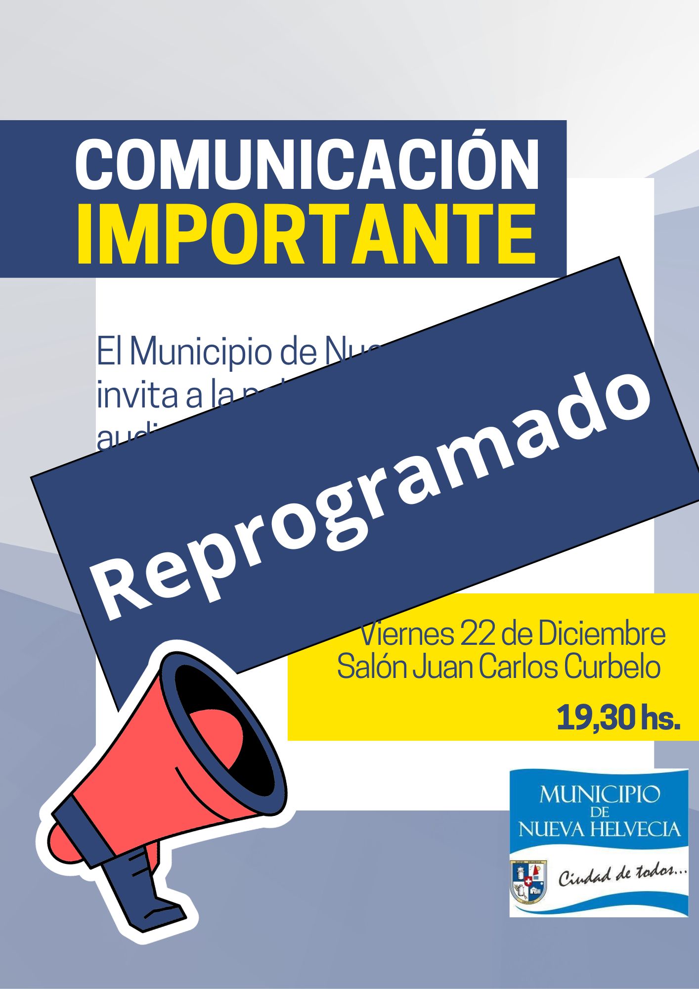 Se reprograma la actividad de rendición de cuentas y audiencia pública anual planificada para el día de mañana viernes 22/12, por los hechos acontecidos en los últimos días, y por la imposibilidad de contar con la asistencia plena del Consejo Municipal por causas de fuerza mayor.