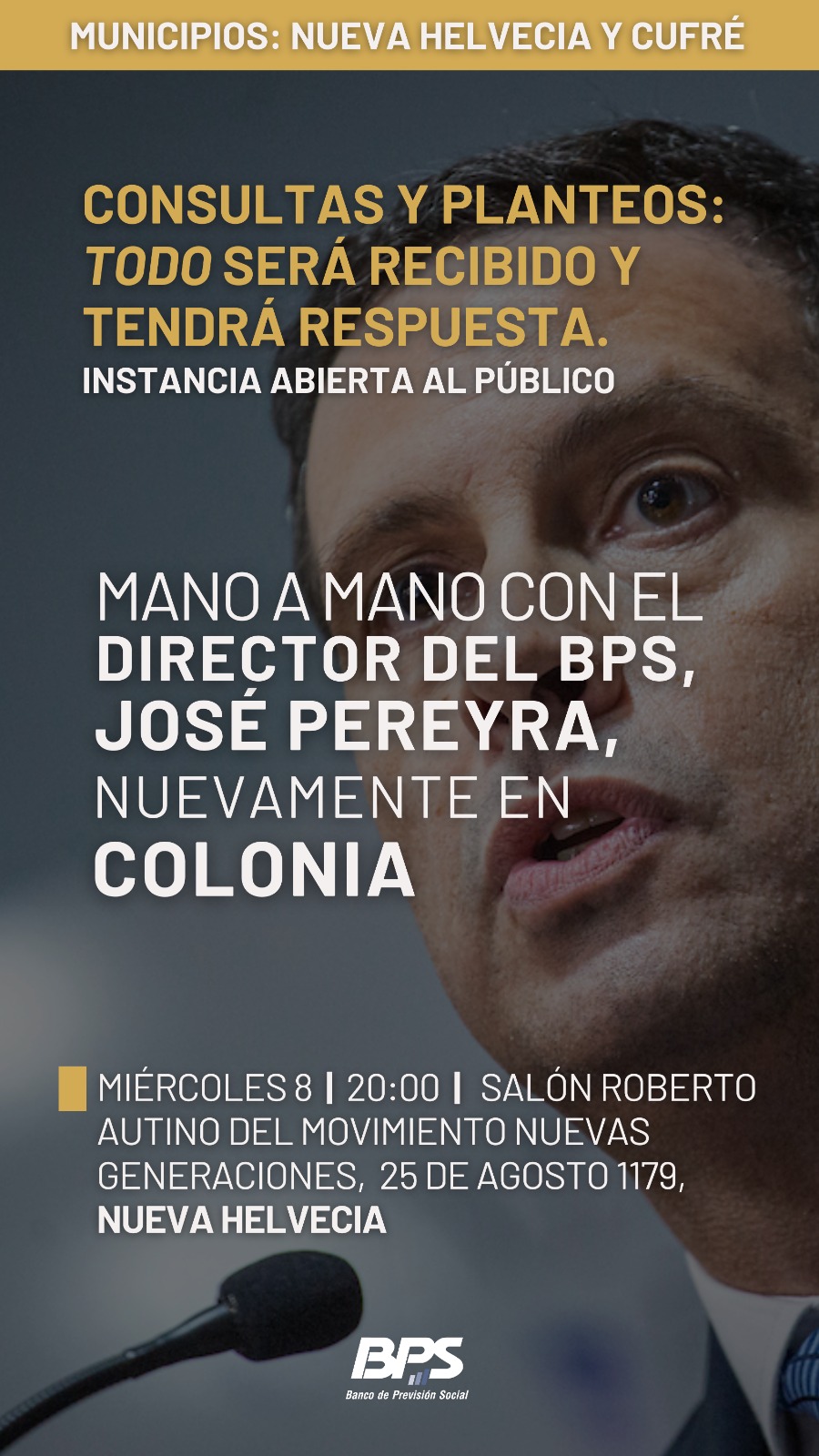 El Director de Empresas del BPS, José Pereyra, invita a reunión con vecinos de Nueva Helvecia y Cufré.